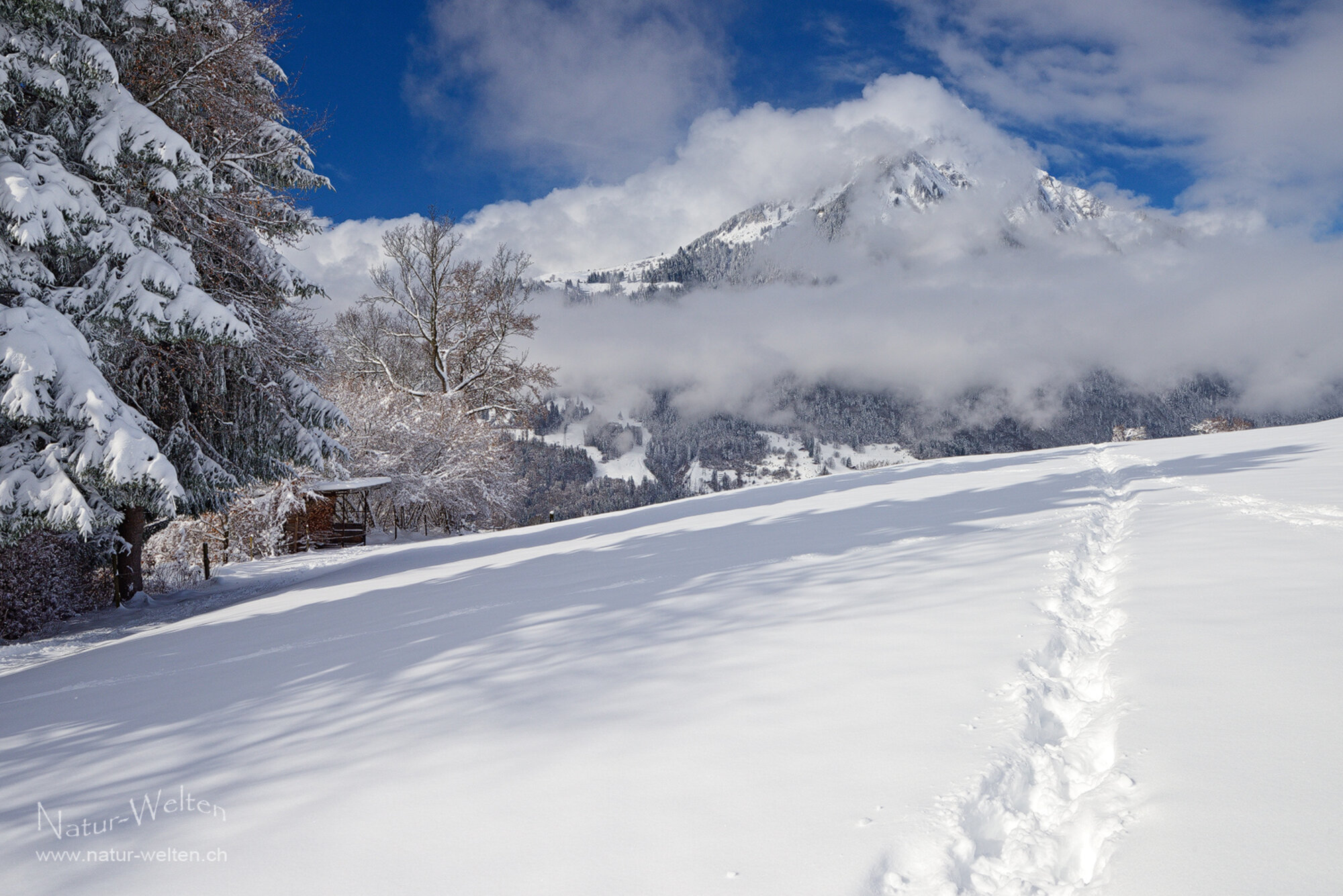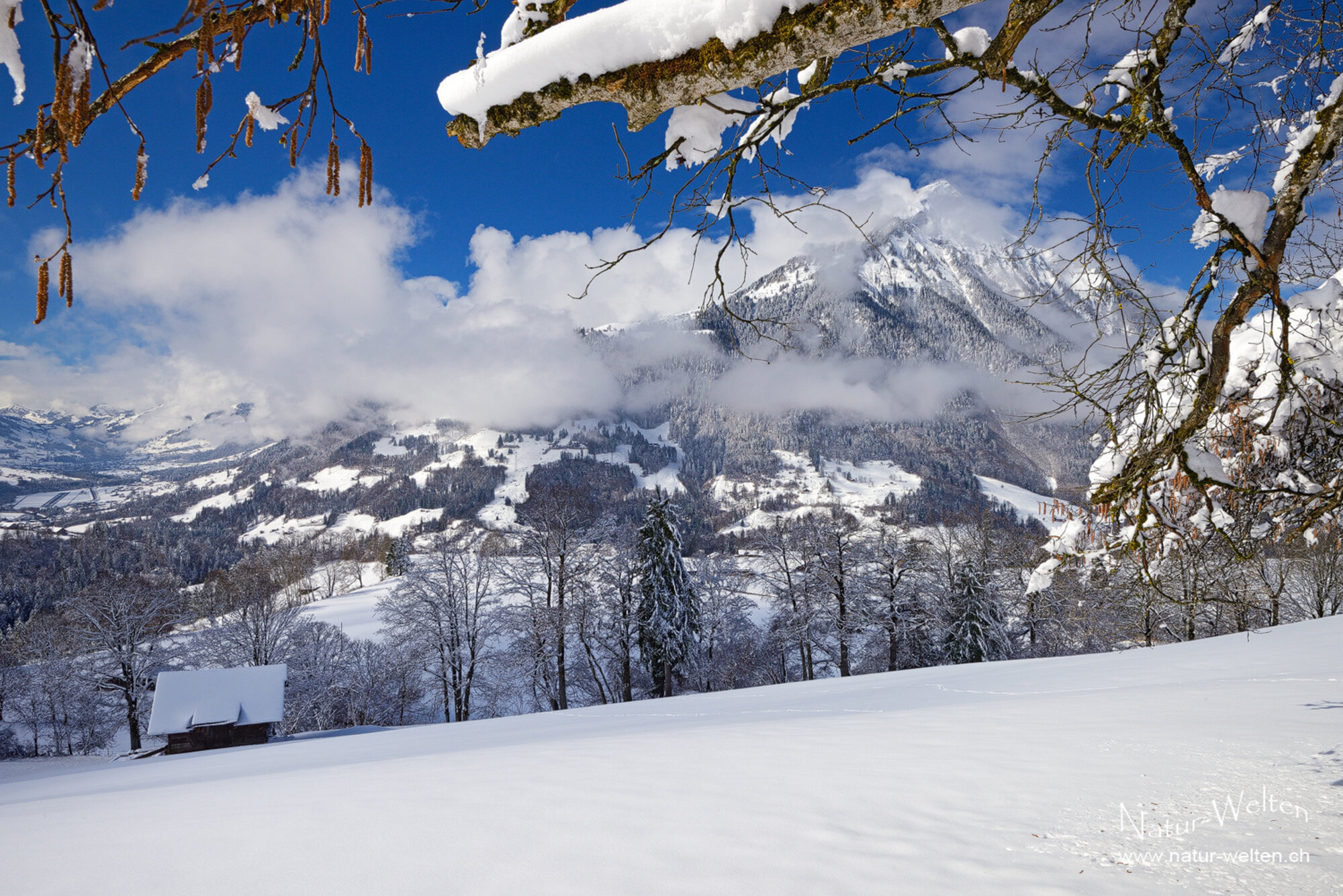 15.3.2026 10:13 - Wolkenküche:Es ist ein gewaltiges Schauspiel, wie die Wolkenküche um den Niesen (2'362m) brodelt. Die Szenerie verändert sich von Minute zu Minute. Manchmal ist der Gipfel unseres Hausbergs zu sehen, dann hüllt er sich wieder in dichte Wolken. Spannend! Nun müssen wir uns jedoch beeilen, denn die Märzsonne lässt den Schnee in Rekordtempo von den Bäumen fallen.