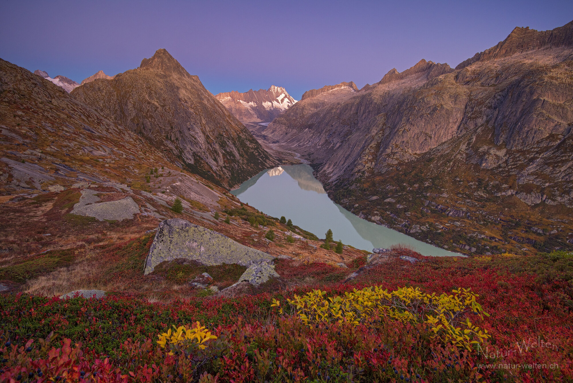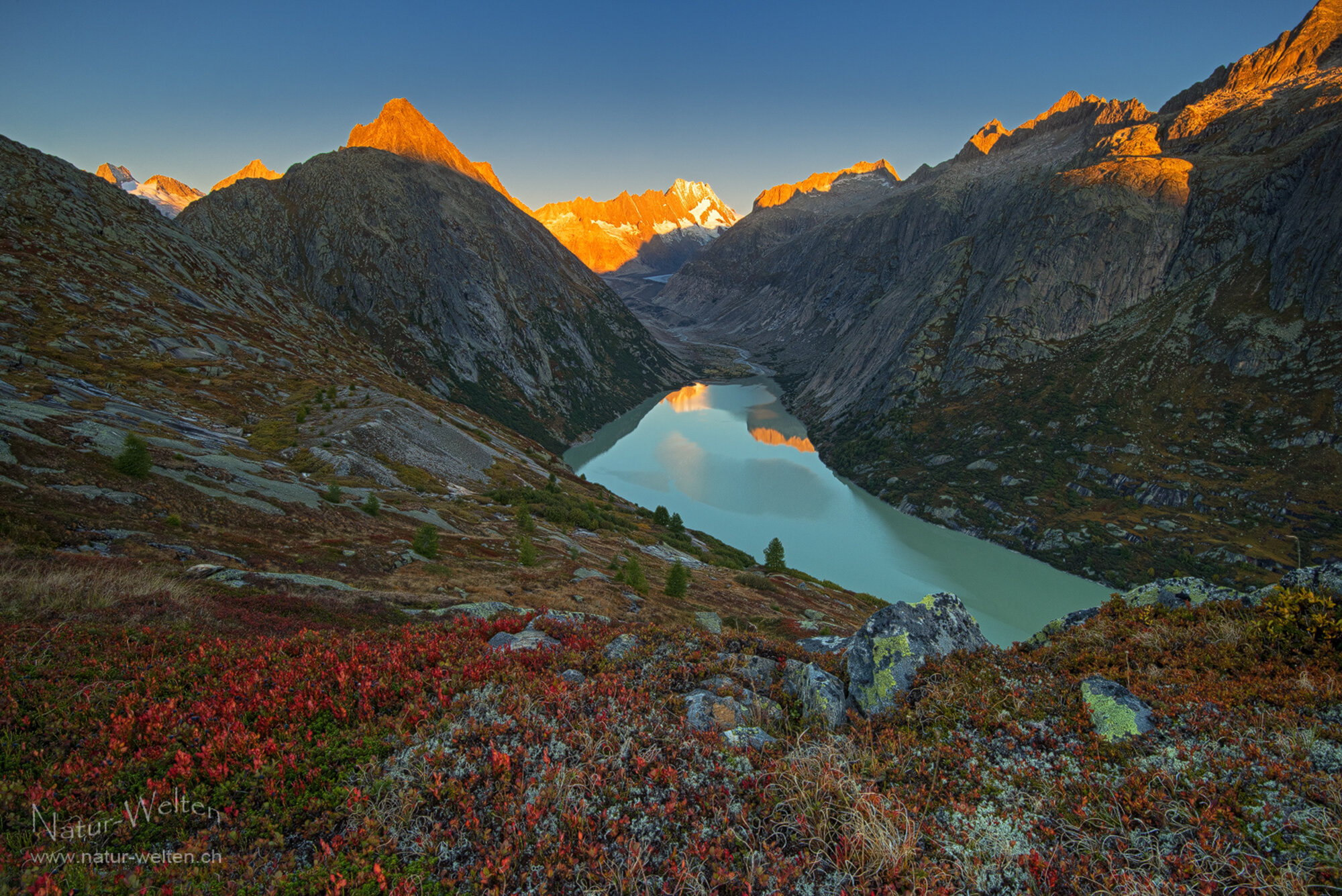 19.9.2025:Auch in diesem Gebiet finden wir wieder diesen wunderbar vielseitigen, skandinavischen Boden mit dem Isländisch Moos. Er hat sich dieses Jahr sehr früh bunt verfärbt. Was für ein Vordergrund für die Bergszenerie rund um das Lauteraarhorn. Nachdem die ersten, warmen Sonnenstrahlen die höchsten Gipfel berührt haben, wandert das Morgenrot nun schnell tiefer und wir geniessen diesen Tagesbeginn in vollen Zügen. Kein Mensch weit und breit, nur wir zwei, hoch oben über dem Grimselsee.