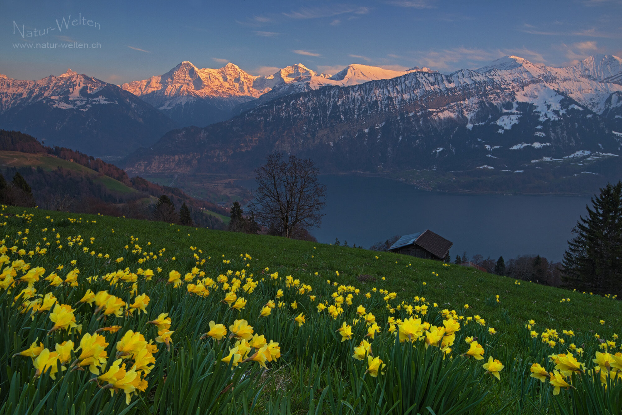 20.4.2026 18:17 - Verhaltenes Alpenglühen:Trotz dem starken Dunst ergibt sich an diesem Abend noch ein verhaltenes Alpenglühen an den Bergen. Stolz präsentiert sich uns über den Osterglocken das Berner Dreigestirn von Eiger, Mönch und Jungfrau. Links ist noch der Zahn des Schreckhorns zu erkennen. Der Thunersee darunter, liegt bereits im Schatten. Der nächste Wetterwechsel kündigt sich an diesem Tag bereits an.