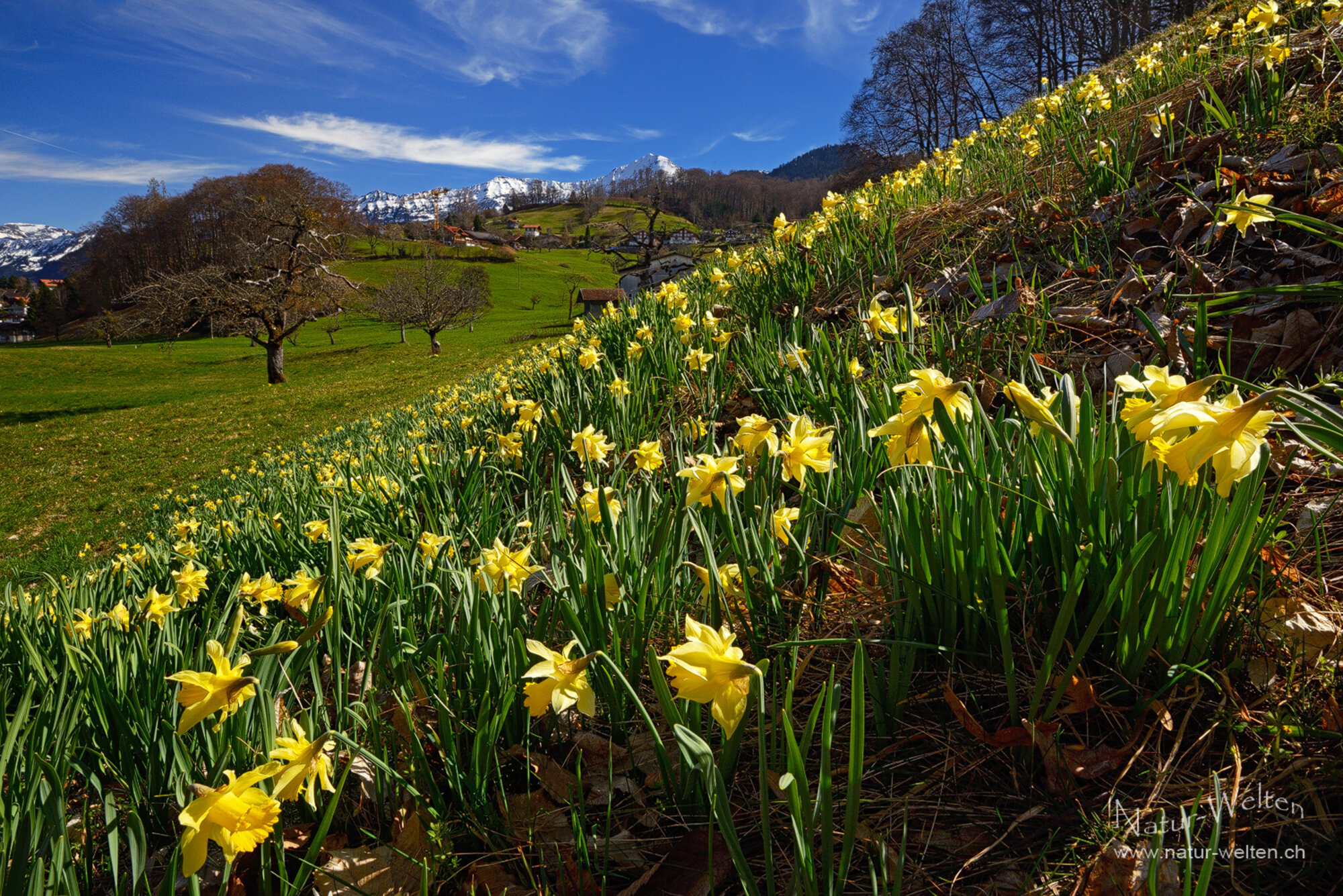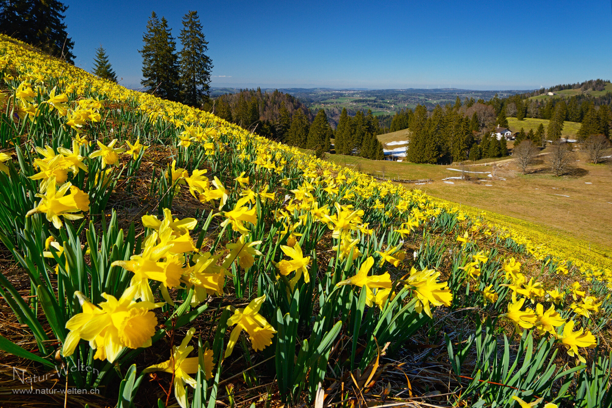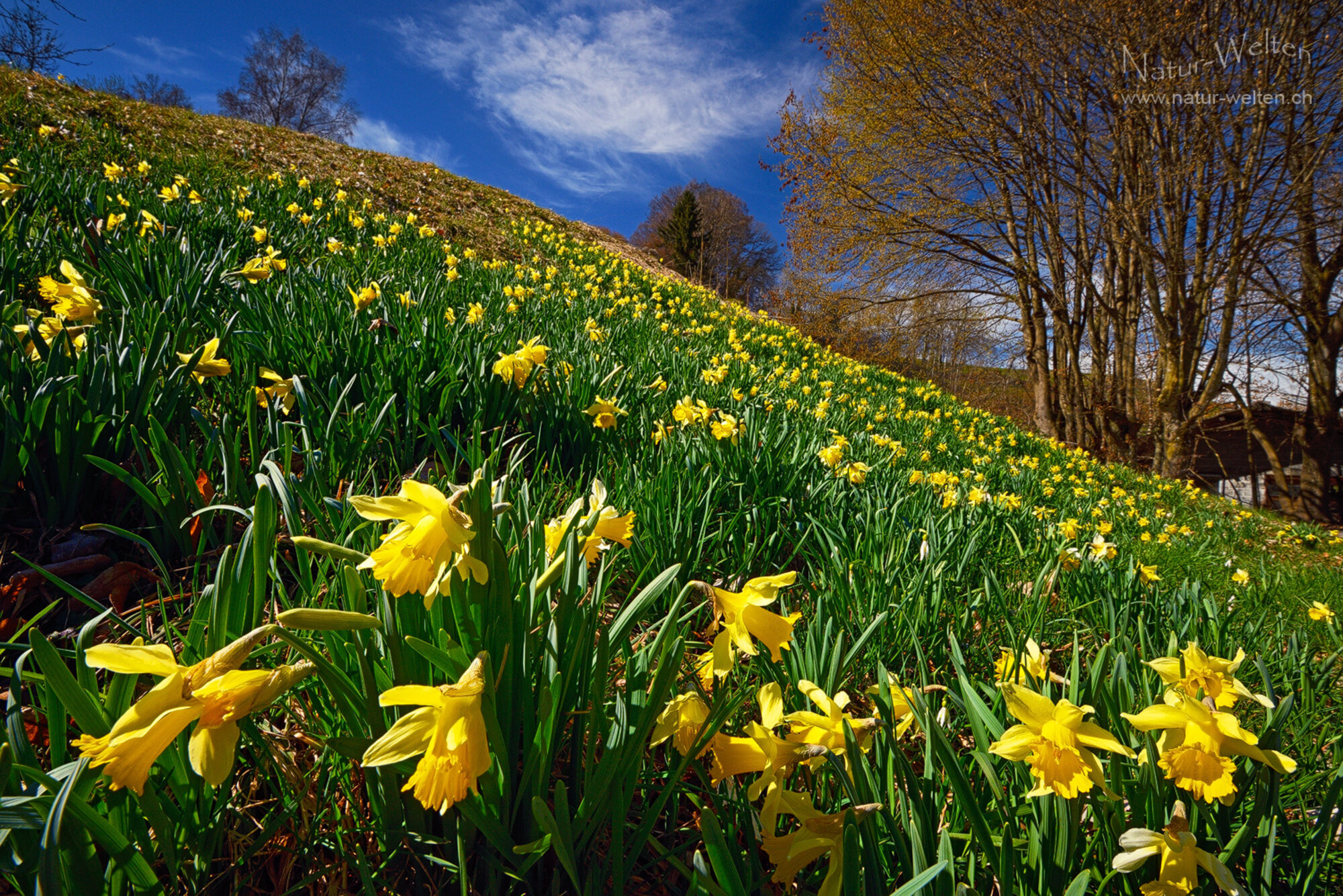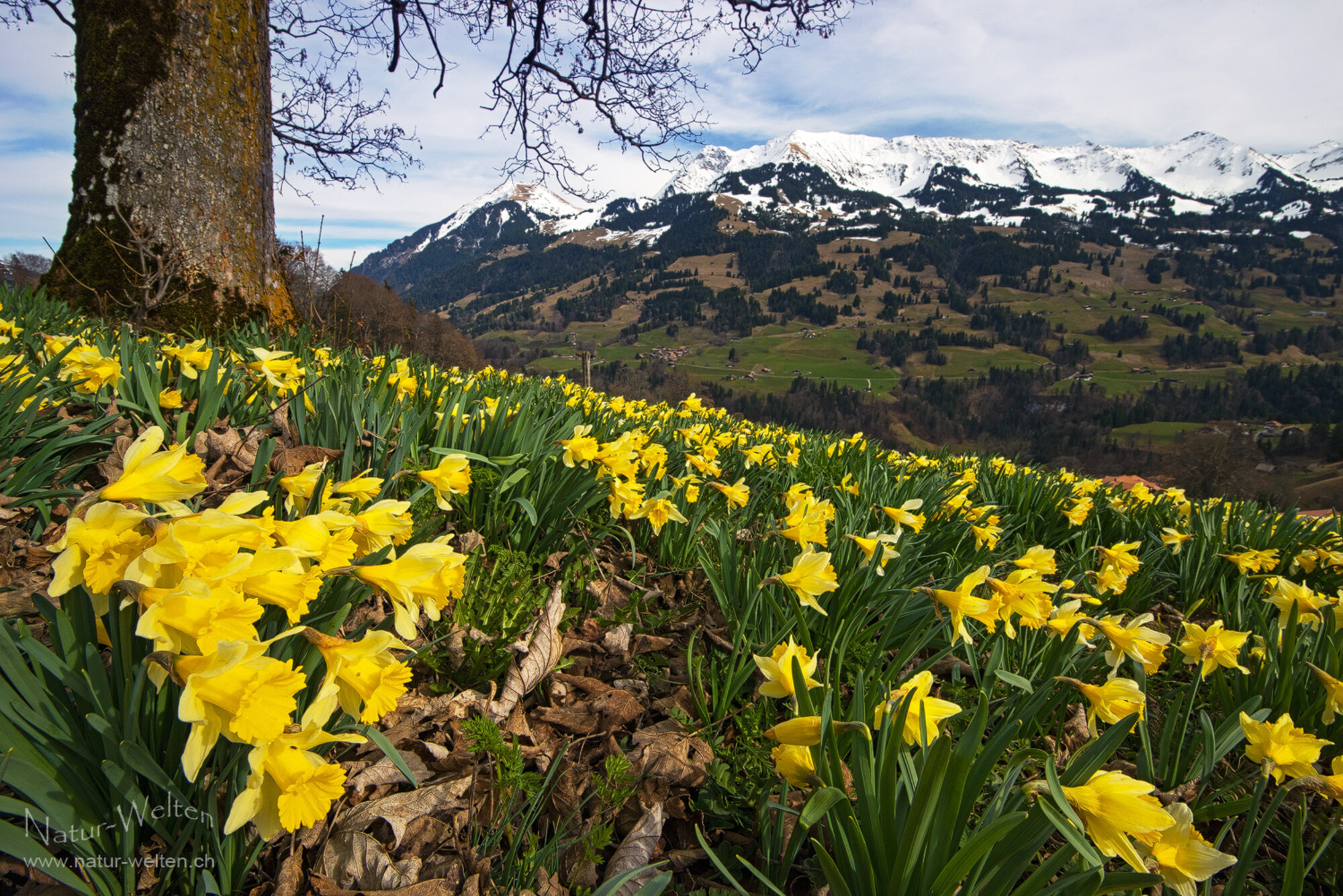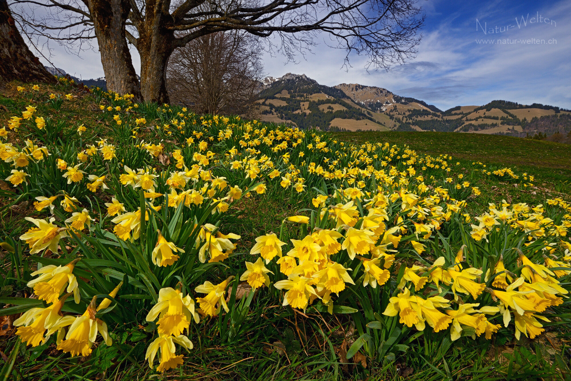 13.3.2026 14:52 - Meer von Osterglocken:Während es draussen bereits wieder schneit, blicken wir noch einmal zurück auf den Frühling, welchen wir Mitte März bereits hatten. Am selben Tag besuchen wir noch die wildblühenden Osterglocken vom Diemtigbergli. Auch diese blühen im laufenden Jahr ausserordentlich intensiv. Der Himmel hat sich leider bereits ein Wenig mit Wolken bedeckt und es ist kühler geworden.