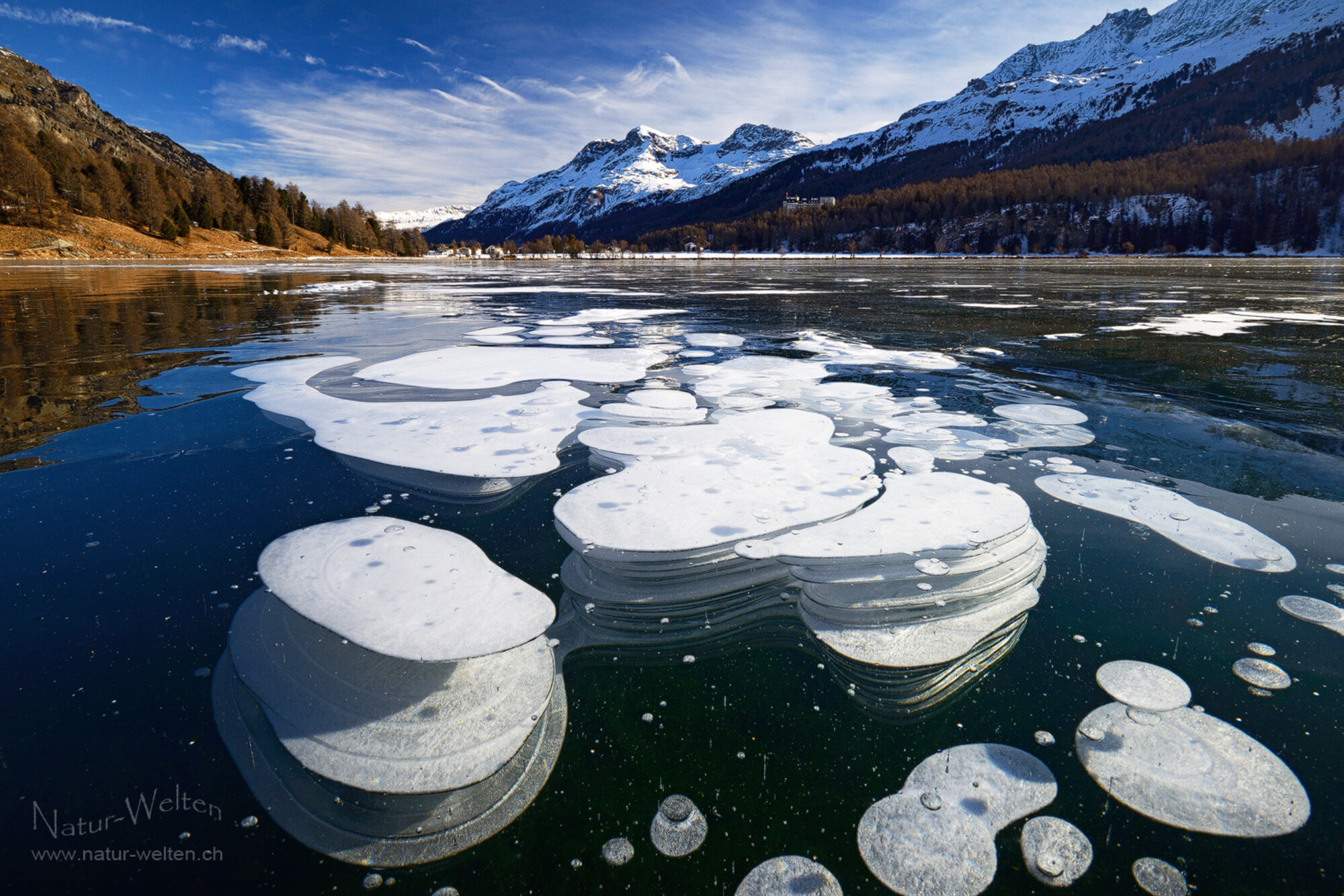 6.1.2026 10:42 - Abschied vom Engadin:Mit dieser Aufnahme ist die Zeit gekommen, um vom Engadin Abschied zu nehmen. An dieser Stelle auf dem Silsersee haben wir noch besonders schön geschichtete Methanblasen gefunden. 14 Lagen konnte ich hier zählen. Es ist schon ein enormes Wunder, mit dem Schwarzeis und wir sind dankbar, dass wir es Anfang Januar erleben durften. Danke an Sandra und Carmen, dass ihr mich habt ziehen lassen, an Rahel für die unkomplizierte Vertretung im Büro, Andi für die angenehme Begleitung und dem Team des Hotels Chesa Randolina für die grosse Gastfreundschaft!
