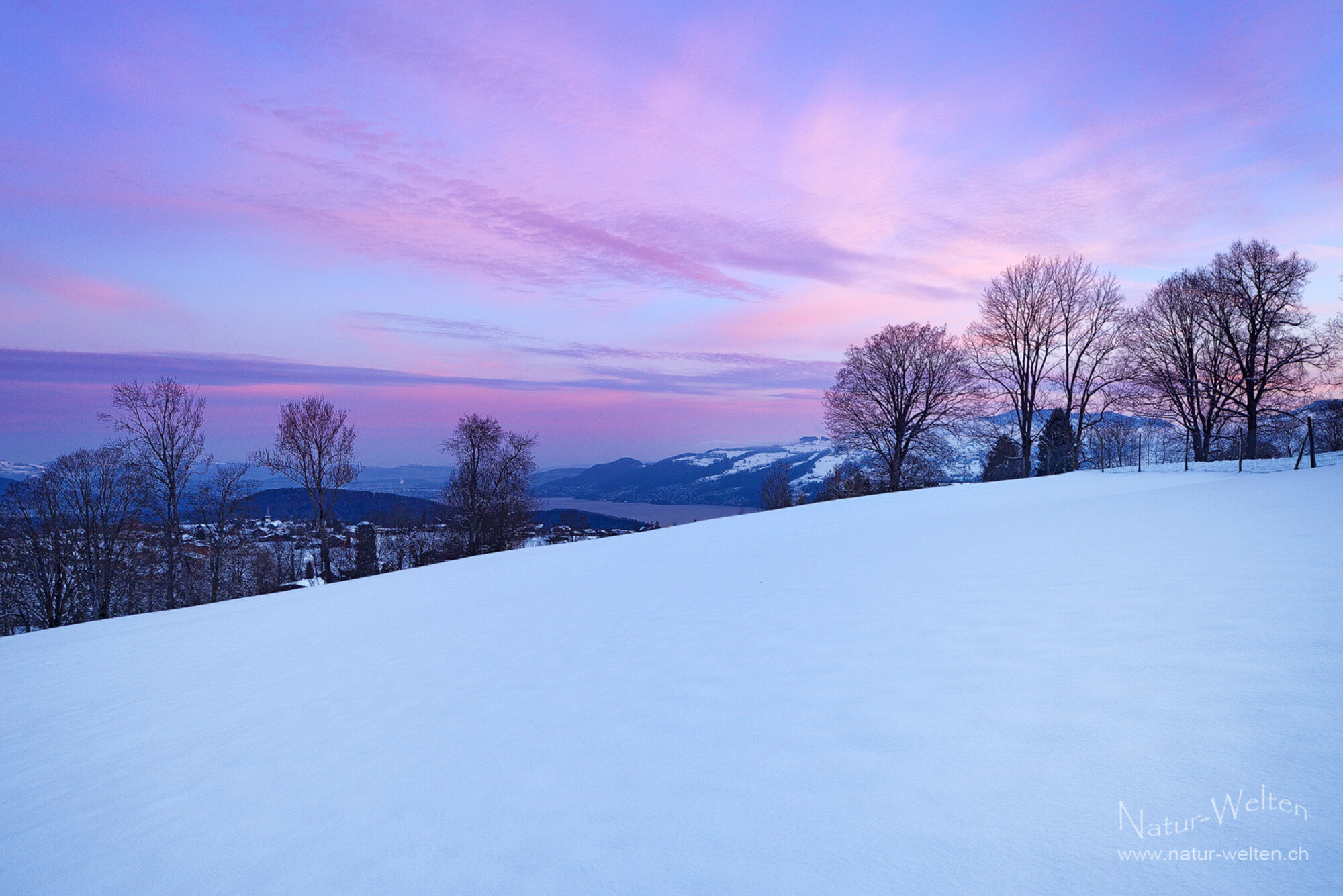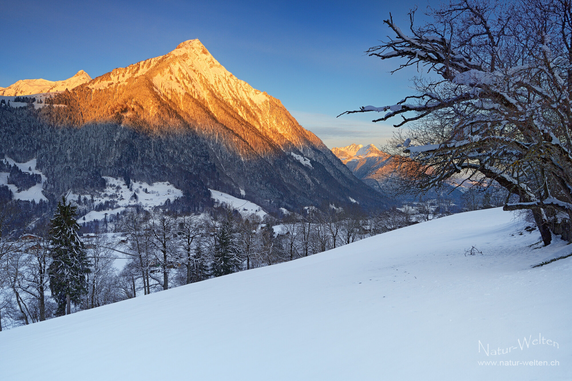 28.3.2026 06:39 - Glühender Niesen:Ende März geht endlich unser Wintertraum in Erfüllung. Die ganze Zeit haben wir darauf gepasst, eine schöne Morgenstimmung einfangen zu können, doch es lag kein Schnee und war insgesamt ein frustrierender Winter. Doch jetzt glüht unser Hausberg, der Niesen (2'362m), intensiv vor uns und wir sind einfach nur noch glücklich! Kein Lüftlein weht an diesem Morgen und die ganze Landschaft liegt tief verschneit, friedlich vor uns.