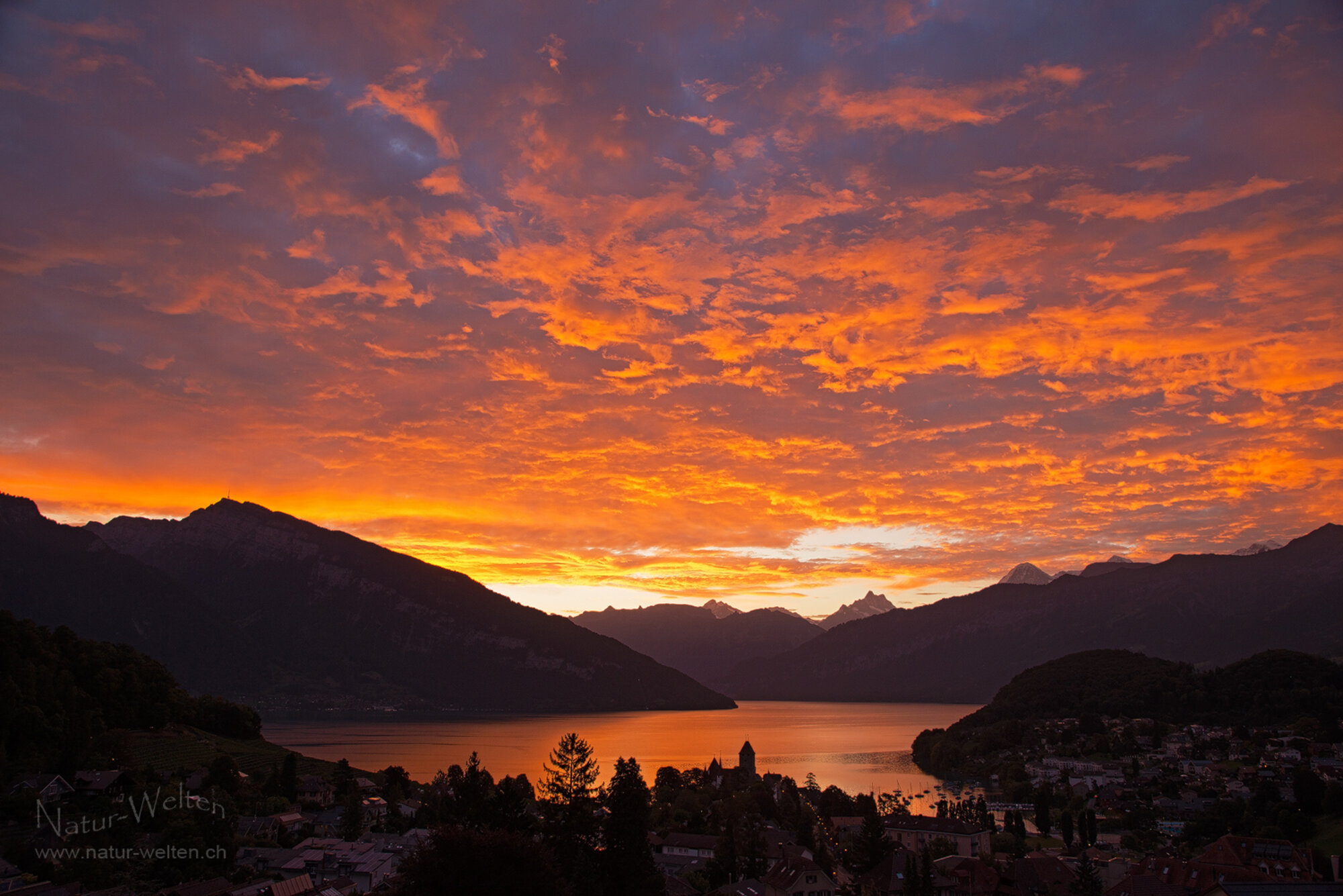 8.9.2025:Föhnwind, lautet die beste Formel für solche Morgenstimmungen im Berner Oberland. Wenn Das Wetter auf beiden Seiten der Berge verschieden ist, tauschen sich starke Winde über den Alpenkamm aus. Damit ergeben sich diese offenen Fenster, durch welche dann die aufgehende Sonne die Wolkendecke von unten beleuchten kann. Und mit ganz viel Glück haben die Wolken genau die Höhe, dass sich dann noch die Schatten der Berggipfel daran abzeichnen. Das gibt es jedoch nur alle zwei bis drei Jahre einmal. Für mich sind solche Stimmungen immer wieder eine Motivation für die anstehenden Bürotage.