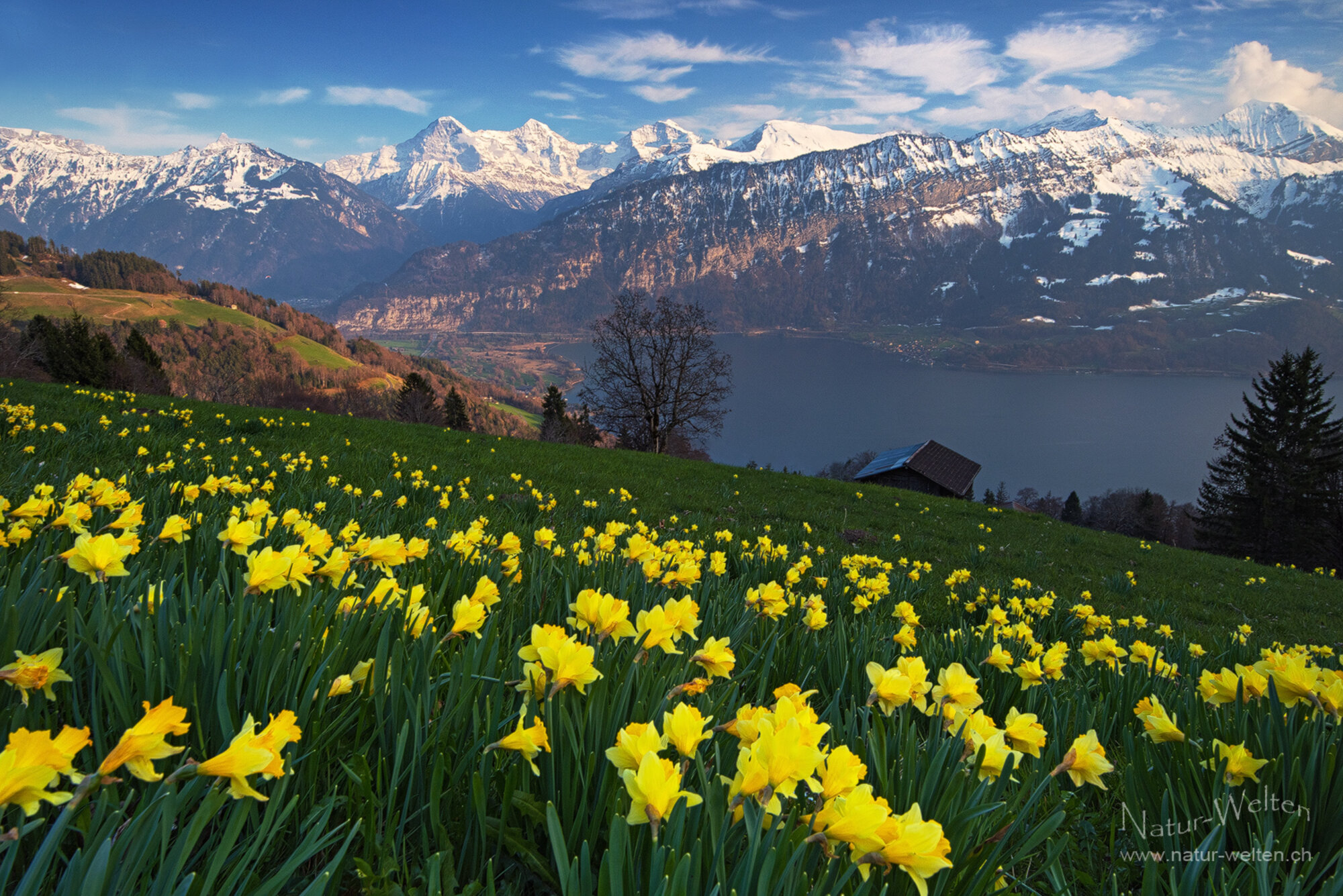 20.3.2026 17:45 - Eine dunstige Sache:Es ist sehr dunstig an diesem Tag im März, sodass wir eigentlich nicht auf ein glühendes Abendrot hoffen dürfen. Als wir in Beatenberg (BE) ankommen, stellen wir fest, dass die malerisch gelegenen Osterglocken schon eher abblühend sind. Dennoch ist die Aussicht auf die Berner Alpen und den Thunersee eine Augenweide. Am Himmel haben sich gerade hübsche Quellwolken gebildet, welche sich jedoch sehr schnell wieder auflösen. Es ist kühler geworden. Trotzdem geniessen wir den Moment und sind gespannt, ob noch eine leichte Verfärbung der frisch verschneiten Berge drinliegt.
