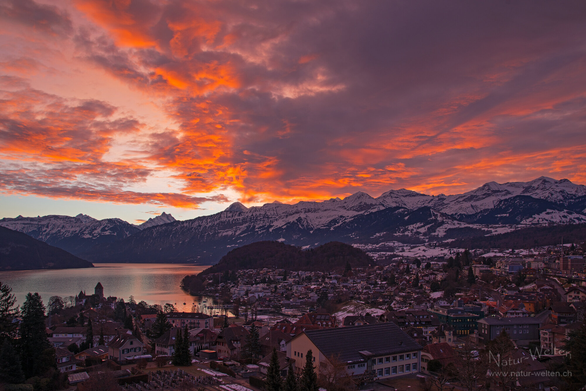 27.1.2026 07:55 - Nichts mehr Neues!:Mit dieser Aufnahme erschöpft sich mein Bestand von aktuellen Fotos. Das gibt mir irgendwie zu denken. Draussen ist es viel zu warm und es liegt bis hoch in die Berge fast kein Schnee. Auch an Morgenstimmungen mangelt es aktuell. Daher hier noch eine Aufnahme von letzter Woche, welche auf dem Turm der Spiezer Dorfkirche entstanden ist. Die Glut war wunderschön anzusehen und es war ein toller Start in den neuen Arbeitstag. Doch nun warte ich sehnlichst auf neue Fotoausflüge und -möglichkeiten!
