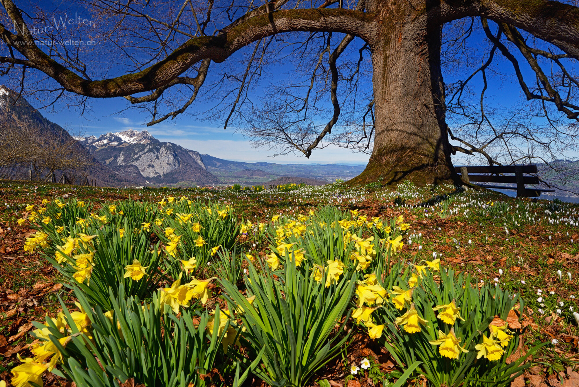 13.3.2026 11:03 - Bevor der Schnee kommt:Zwei Tage vor dem grossen Wintereinbruch Mitte März, widmen wir uns fast den ganzen Tag den wildblühenden Frühlingsblumen unserer Heimat. Zuerst wandern wir von Krattigen hoch nach Aeschiried, während Carmen sich im Kindergarten befindet. Es ist ein herrlich warmer Frühlingstag und man könnte nicht glauben, dass schon in Kürze 30cm Schnee liegen werden. Hier eine idyllische Komposition aus Aprilglocken und Krokus. Da möchte man sich doch am liebsten gleich auf das Bänkli setzen und einfach nur verweilen.