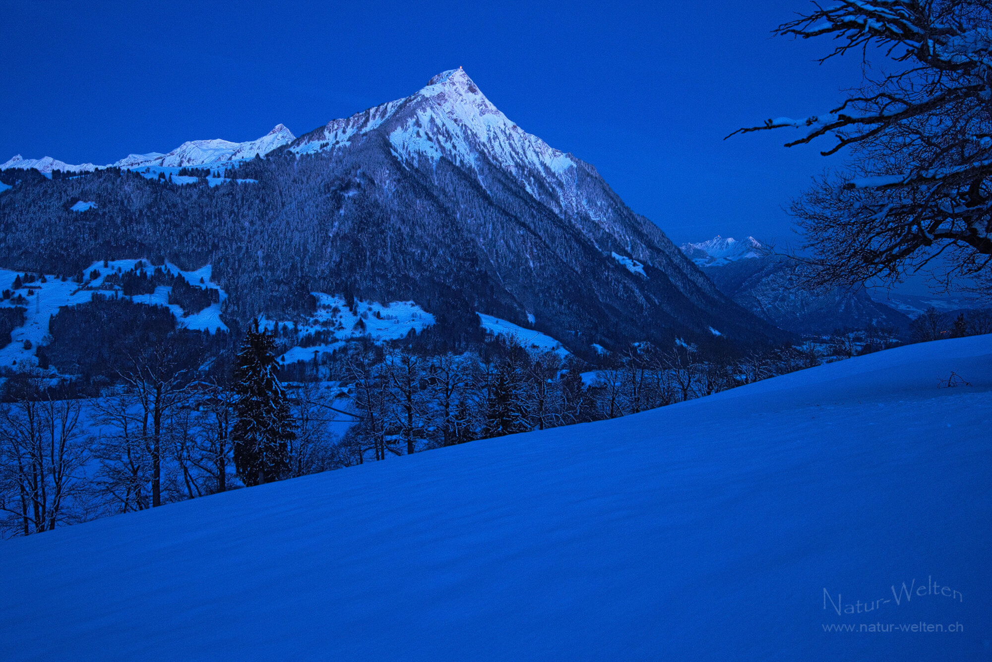 28.3.2026 05:53 - Blaue Stunde in Aeschi:Stellt Euch vor, es ist eine Woche vor Ostern, also genau vor einer Woche, und Ihr steht am Morgen früh in dieser prächtigen Winterszenerie. Klirrende Kälte, bei -6.5 Grad, jedoch zum Glück windstill. Dabei erlebt Ihr den schönsten Wintermorgen des ganzen Winters 2025/26. Keine Spur in der jungfräulich frisch verschneiten Landschaft, der Gesang der Vögel in der Luft und die Berggipfel beginnen im ersten Tageslicht weiss zu leuchten, während die übrige Landschaft die Farbe der Blauen Stunde übernimmt. Schöner könnte doch ein Tag nicht beginnen! Ich geniesse die Stimmung in Aeschiried mit Blick auf den Niesen in Begleitung von Andi Wipf.