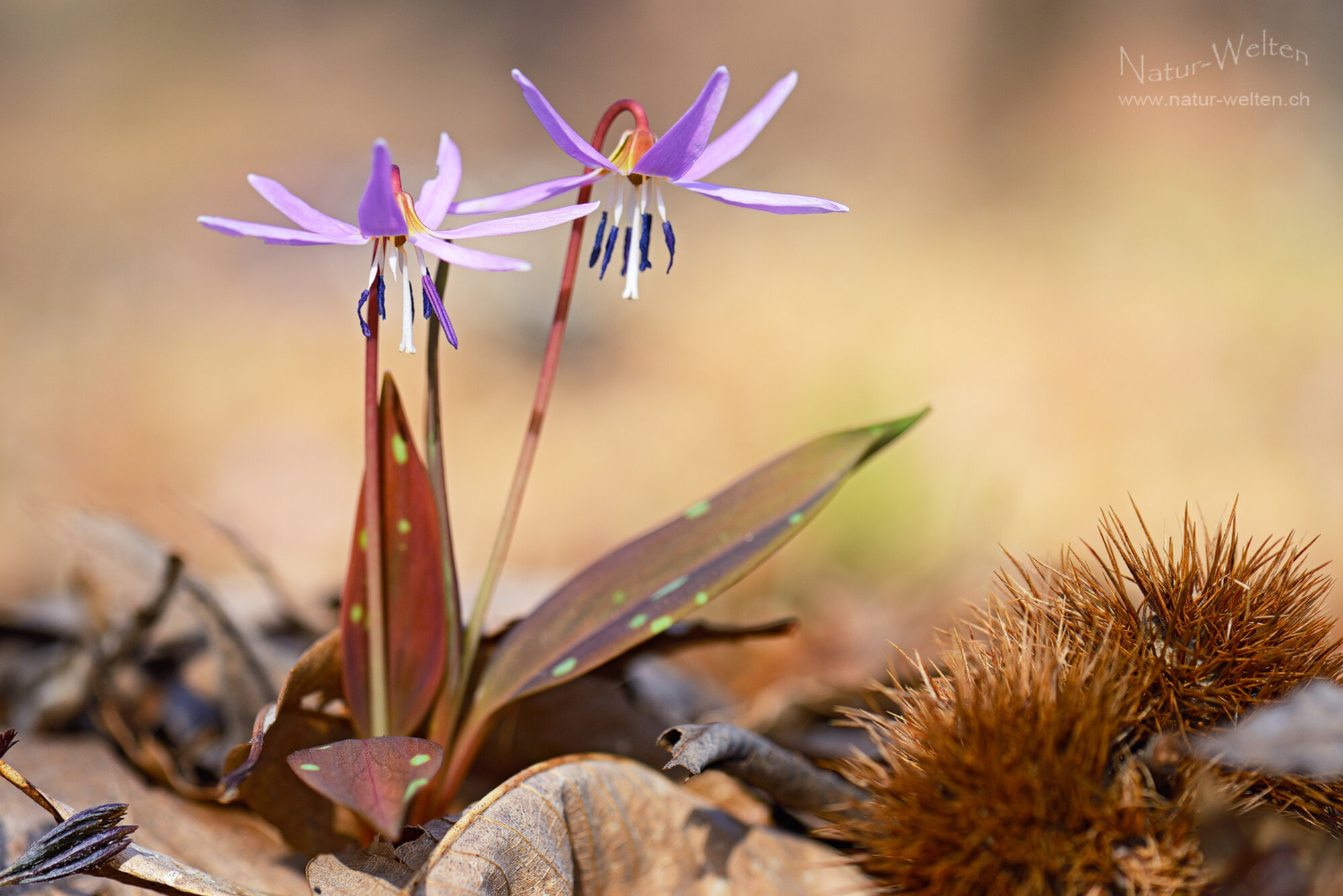 7.3.2026 11:11 - Kastanienwaldschönheiten:Im Kastanienwald bei Stabio (TI) wimmelt es von diesen kleinen, hübschen Schönheiten. Hier haben sich die Blütenblätter der Hundszahnlilien gerade frisch geöffnet und werden sich nun ganz gegen oben klappen. Dies ist das typische Merkmal dieser seltenen Wildblumen. Daneben eine stachelige Schale der Edelkastanien. Lange kriechen wir hier mit unseren Kameras wieder auf dem Boden umher und geniessen die Frühlingswärme.